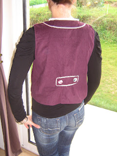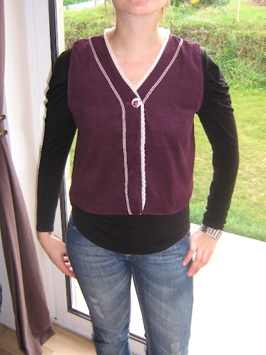 un gilet en velours milleraies prune agrémenté de dentelles et d'une martingale